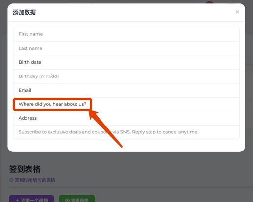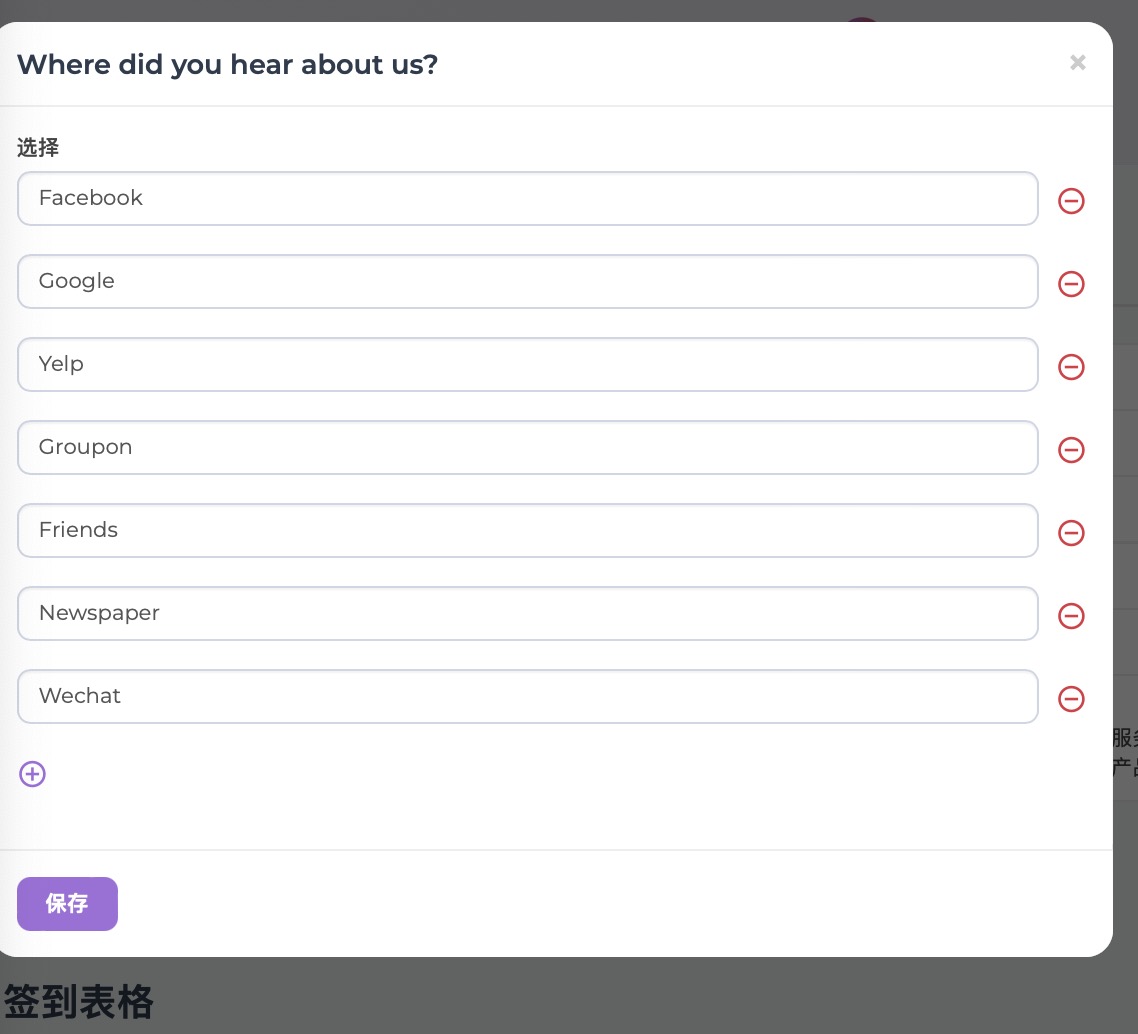 您进入页面后,点击索引栏左下方的设置项,选择客户签到资料;在该页面点击添加数据,选中“where did you hear about us?”项添加。添加后点击其旁边的编辑,里面有预设项目(如Facebook、Google、小红书等)也可根据情况自行添加,客人签到后就能看到其获知店铺的途径。具体步骤如下图所示: